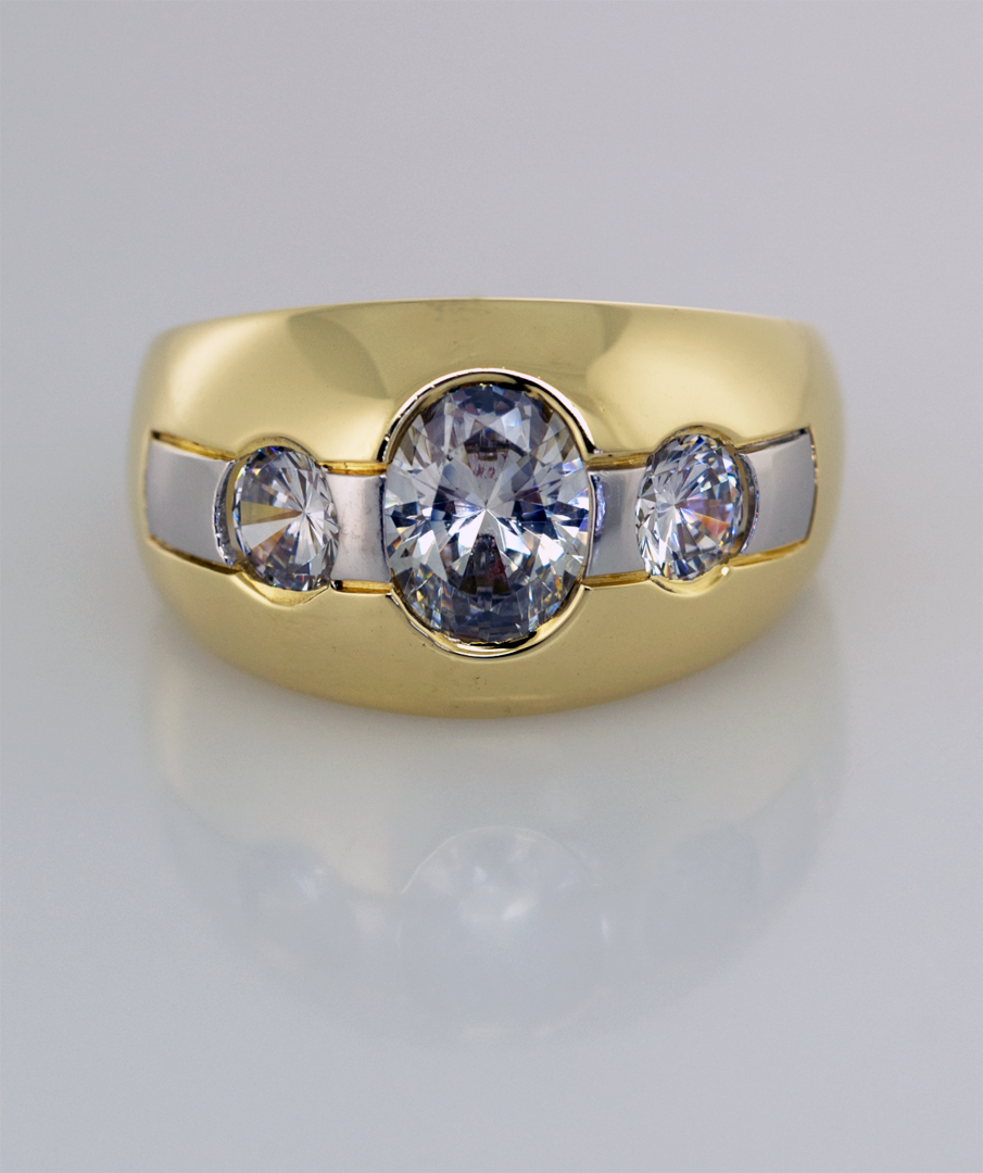18KT yellow gold contemporary 14mm dome ring with a center platinum stripe, flush set with one 2.00cts. oval center diamond, and two 0.33ct. round brilliant shaped side diamonds. A copyrighted original by Thomas Michaels.
